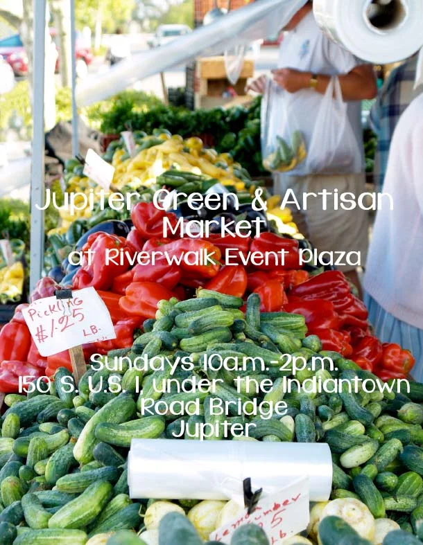 The Jupiter Green & Artisan Market at Riverwalk Event Plaza is a year-round market and is located along the Intracoastal Waterway in Jupiter.  It is situated on the water where one can enjoy the shade under the Indiantown Road Bridge and enjoy the views of passing boats. This is a green and artisan market and a public event with vendors displaying a wide assortment of produce, specialty foods, baked goods, crafts, art and entertainment. This is accomplished by providing fresh, locally-grown produce to the community and encouraging the promotion of the agricultural industry.  It also provides an informal, social gathering place in an open-air setting which promotes a sense of community and stimulates interaction among neighbors in the Northern Palm Beach…